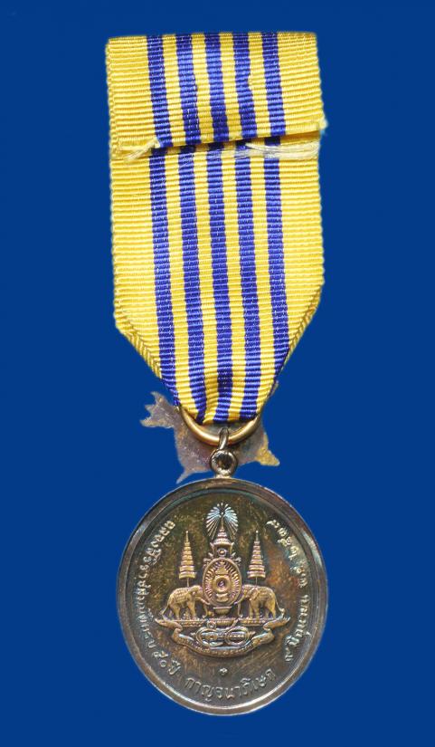 เหรียญแพรแถบเนื้อเงิน ปีกาญจนาภิเษก ในหลวงนั่งบัลลังก์ 2539 ฉลองสิริราชสมบัติครบ 50 ปี กาญจนาภิเษก (9 มิถุนายน 2539) (บุรุษ) เนื้อเงิน เหรียญมีขนาดเส้นผ่าศูนย์กลาง แนวนอน 3.2 ซม. แนวตั้ง 3.6 ซม. เหรีย |