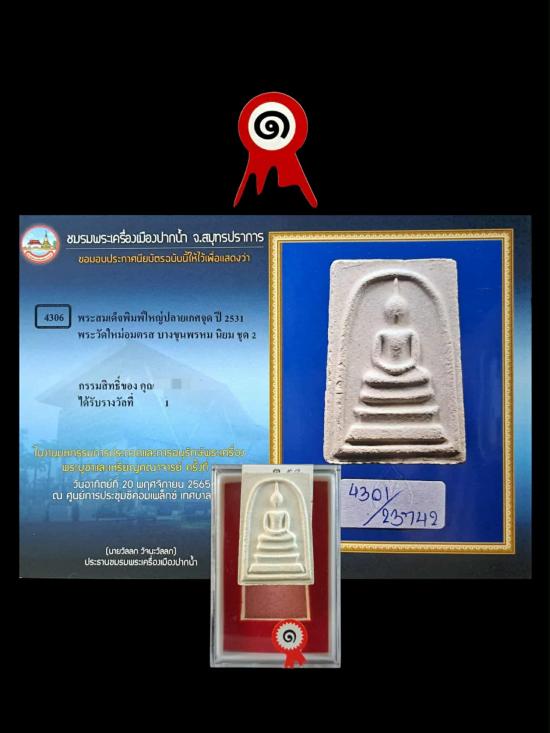 แชมป์รางวัลที่1 สมเด็จบางขุนพรหมปี2531 พิมพ์ใหญ่ บล็อกลึกยุคต้น ยอดนิยม พบน้อย หลังตรายางคมชัด พระยุคต้น กดพิมพ์แรกๆ คมชัดลึก พร้อมกล่องงานประกวดและใบประกาศฯ