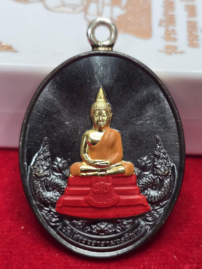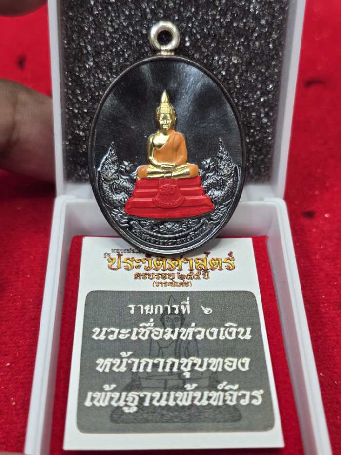 หลวงพ่อโสธรรุ่นประวัติศาสตร์ครบรอบ 255 ปี วาระพิเศษ (วัดสร้าง) เนื้อนวะห่วงเชื่อมเงินหน้ากากชุบทองเพ้นท์ฐานเพ้นท์จีวร เลข60 พร้อมกล่องเดิม |
