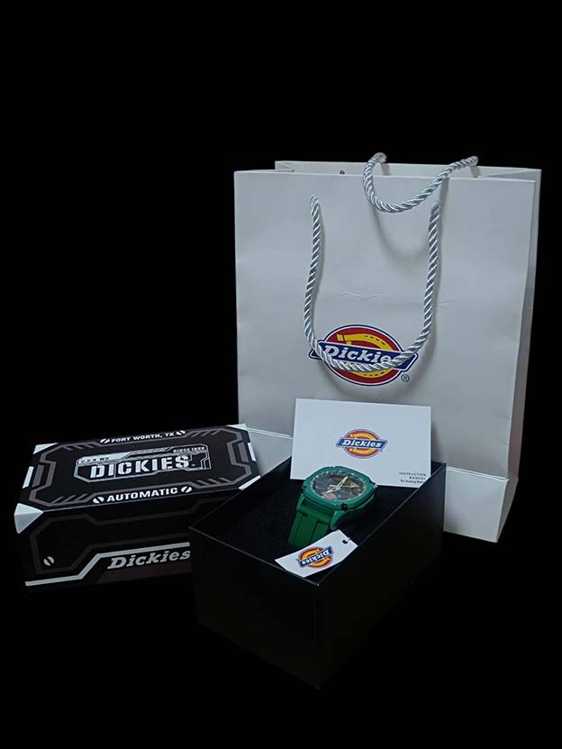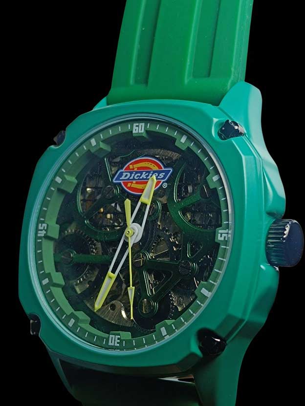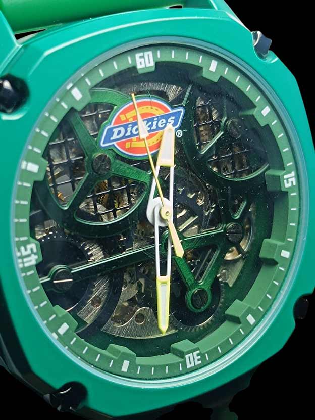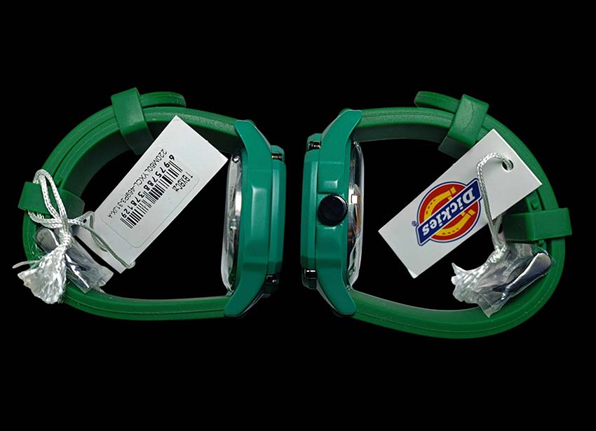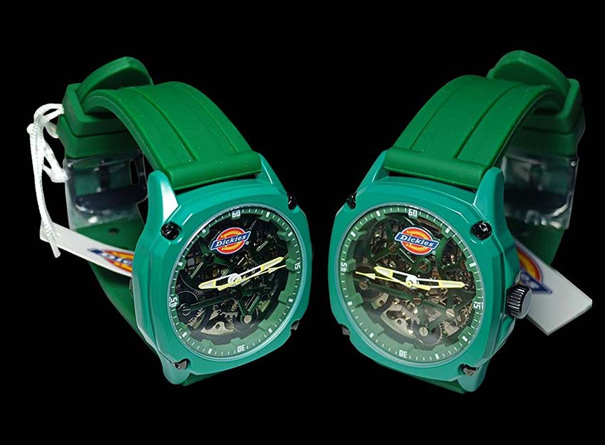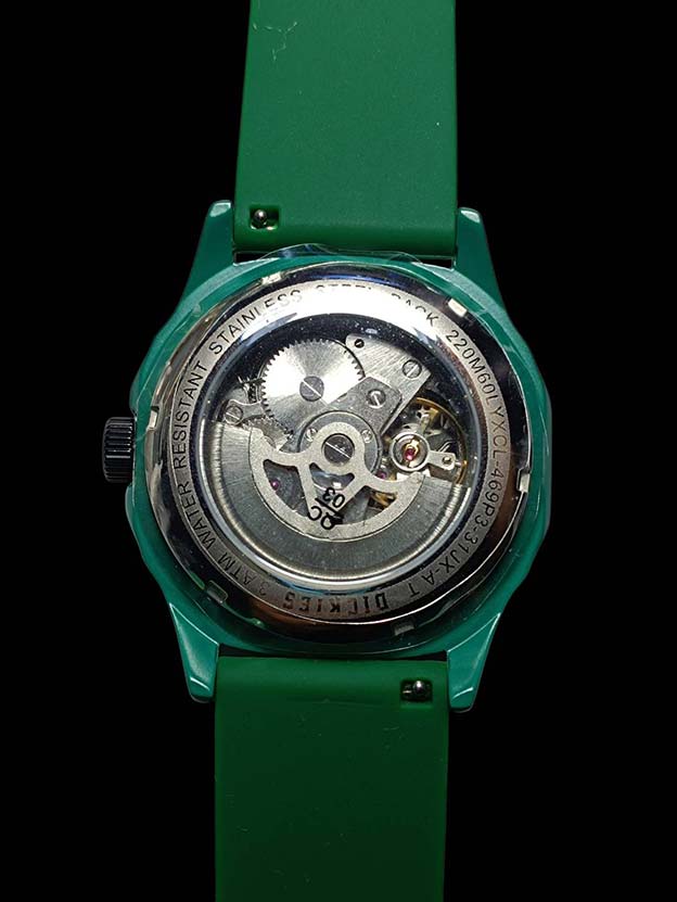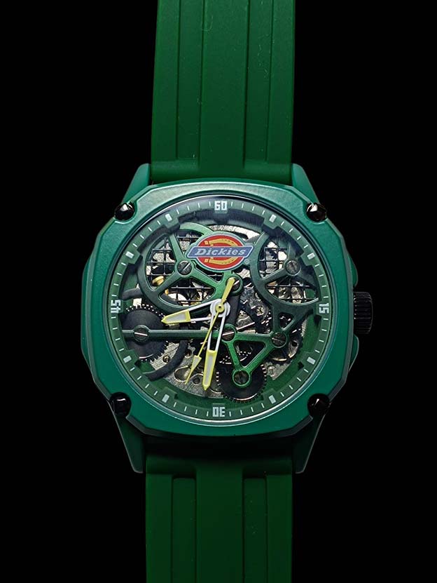 นาฬิกาข้อมือผู้ชาย ยี่ห้อ Dickies สีเขียว รุ่น 30 220M60LYXCL-469P3-31JX-A ขนาดตัวเรือน+เม็ดมะยม 44.4 มม ไม่เคยใช้ ซีลพลาสติกหลังเดิมๆ เก่าเก็บ กล่อง ใบ ถุง ครบ ระบบ mechanical movement กลไกแบบไขลาน สภาพพร้อมใช้งาน