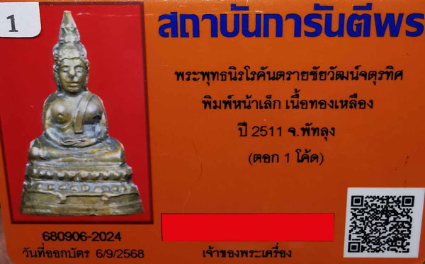 พระพุทธนิรโรคันตรายชัยวัฒน์จตุรทิศ พิมพ์หน้าเล็ก เนื้อทองเหลือง ปี2511 จ.พัทลุง(ตอก1โค้ด) + บัตรG-pra สภาพเดิมค่ะ |