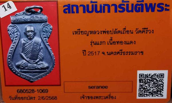 เหรียญหลวงพ่อปลัดเถื่อน วัดคีรีวง รุ่นแรก เนื้อทองแดง ห่วงเดิม ปี2517 จ.นครศรีธรรมราช + บัตรG-pra สภาพสวยเดิมค่ะ สภาพตามรูปทุกประการค่ะ