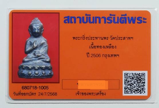 พระกริ่งประทานพร หรือ พระกริ่งดีดน้ำมนต์ วัดปราสาทบุญญาวาส กรุงเทพ ปี ๒๕๐๖ เนื้อโลหะผสม พิมพ์นี้เป็นอีกหนึ่งพิมพ์ที่หายาก และไม่ค่อยพบเจอ จัดเป็นพิมพ์มาตรฐานอีกพิมพ์นึงของวัดประสาท เป็นพิมพ์ที่สร้างล้อของท่านเจ้าคุณเจีย วัดโพธิ์ องค์พระมีขนาด ๒.๐๐ x ๓.๕๐ ซม. พระรุ่นนี้ดำริสร้างโดยท่านพระครูสมุห์อำพล อดีตเจ้าอาวาสวัดประสาทฯ ในคราวหาทุนบูรณะวัดจากเหตุเพลิงไหม้ใหญ่ โดยได้อาจารย์สวัสดิ์ เดชพ่วง สร้างถวายท่านพระครูสมุห์อำพล และเข้าพิธีปลุกเสกที่วัดประสาทบุญญาวาส ซึ่งทำพิธีพุทธาภิเษกโดยมีพระเกจิจากทั่วประเทศร่วมปรกปลุกเสก มากกว่า ๑๐๘ รูปหมุนเวียนร่วมพิธีพุทธาภิเษก พิธีวัดประสาทบุญญาวาส สามเสน กรุงเทพ ปี ๒๕๐๖ นับเป็นพระที่ปลุกเสกพิธีใหญ่พร้อมกับพระเนื้อผงหลวงปู่ทวด วัดประสาทบุญญาวาส จะว่าไปแล้วพิธีเป็นรองแค่พิธีฉลอง ๒๕ พุทธศตวรรษเลยทีเดียว และมีพระเกจิอาจารย์ต่างๆ และผู้ศรัทธาได้มอบผงวิเศษ ผงพุทธคุณและวัตถุมงคลโลหะเสกต่างๆ เข้าร่วมในการสร้างอย่างมากมาย อาทิ พระเจ้าวรวงศ์เธอ พระองค์เจ้าเฉลิมพลฑิฆัมพร ได้มอบถวายวัสดุการสร้างพระหลวงปู่ทวดวัดช้างให้ อาจารย์เทพ สาริกบุตร ถวายชนวนในการหล่อพระกริ่ง อาจารย์นิรันดร์ แดง วิจิตร ถวาย ชนวนพระกริ่งวัดสุทัศน์ฯ รายนามพระเกจิอาจารย์ที่มีชื่อเสียงอีกหลายรูป อาทิ.. หลวงปู่โต๊ะ วัดประดู่ฉิมพลี, หลวงปู่นาค วัดระฆังฯ, หลวงพ่อเทียม วัดกษัตราธิราช, หลวงพ่อจง วัดหน้าต่างนอก, หลวงพ่อพรหม วัดช่องแค, หลวงพ่อเงิน วัดดอนยายหอม, หลวงพ่อเต๋ วัดสามง่าม, หลวงพ่อคง วัดวังสรรพรส, หลวงพ่อน้อย วัดธรรมศาลา, หลวงพ่อแทน วัดธรรมเสน, หลวงพ่อเนื่อง วัดจุฬามณี, หลวงพ่อมุ่ย วัดดอนไร่, หลวงพ่อแต้ม วัดพระลอย, หลวงพ่ออยู่ วัดหนองพะอง, หลวงพ่อลมูล วัดเสด็จ, หลวงพ่อกี๋ วัดหูช้าง, และพระอาจารย์ทิม วัดช้างให้ เป็นต้น นับเป็นพระกริ่งเนื้อโลหะที่ทรงคุณค่า ก้นใต้ฐานอุดเม็ดกริ่งที่ใต้ฐาน ตะไบแต่ง ไม่มีตอกโค๊ด