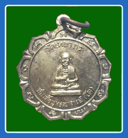 กะไหล่เงิน สวย-220*เหรียญดอกไม้ 9พระพุทธ หลังสมเด็จโตฯ วัดเทพากร ปี2514 หลวงพ่อกวย,ลป.โต๊ะ ปลุกเสก |