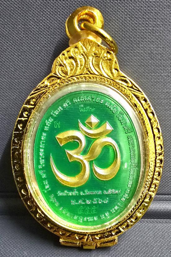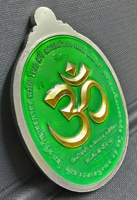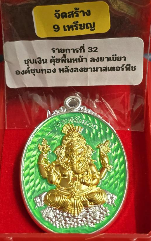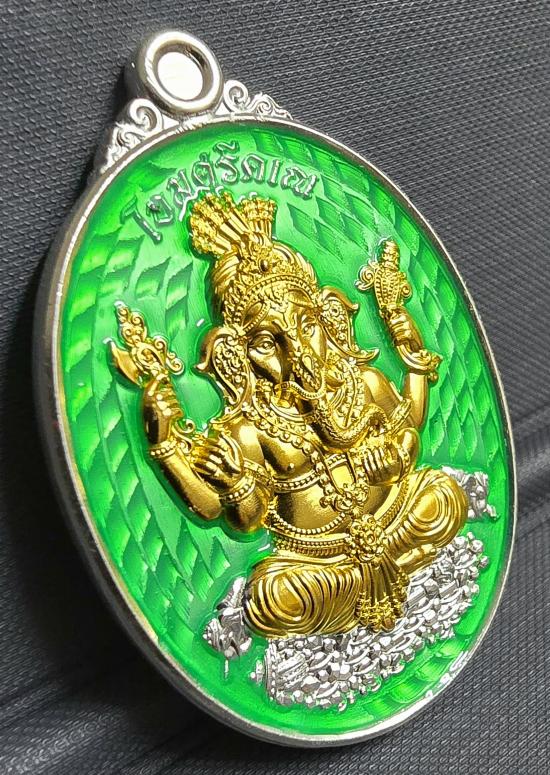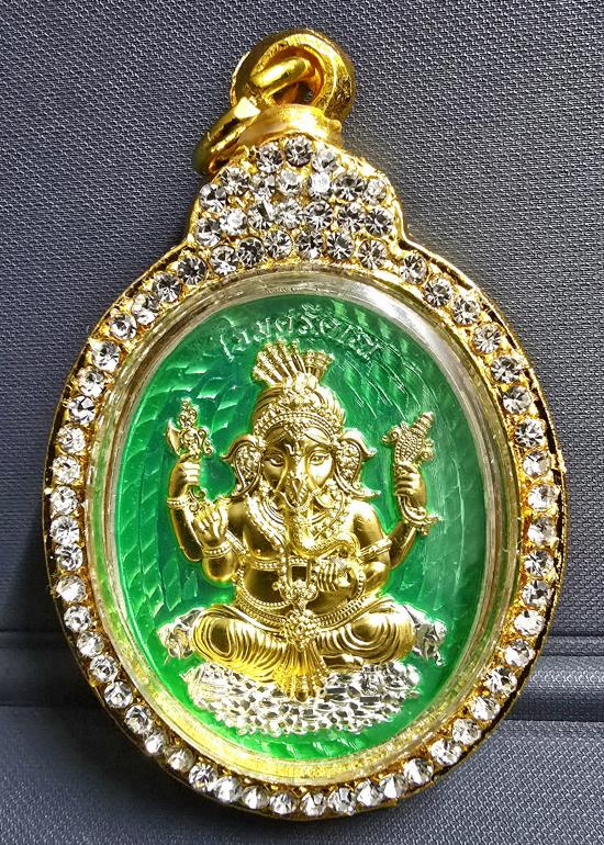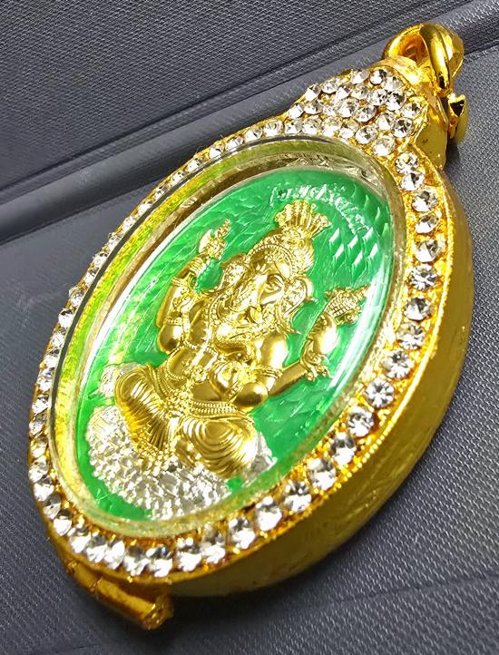 สร้าง 9 องค์ หมายเลข ๕๕๕..พระพิฆเนศ "โอมศรีคเณ" วัดท้ายน้ำ จ.พิจิตร  เนื้อชุบเงิน คุ้ยพื้นหน้า ลงยาเขียวหน้า-หลังมาสเตอร์พีช องค์ชุบทองหน้า-หลัง  เลี่ยมกรอบชุบทองฝังเพชร |