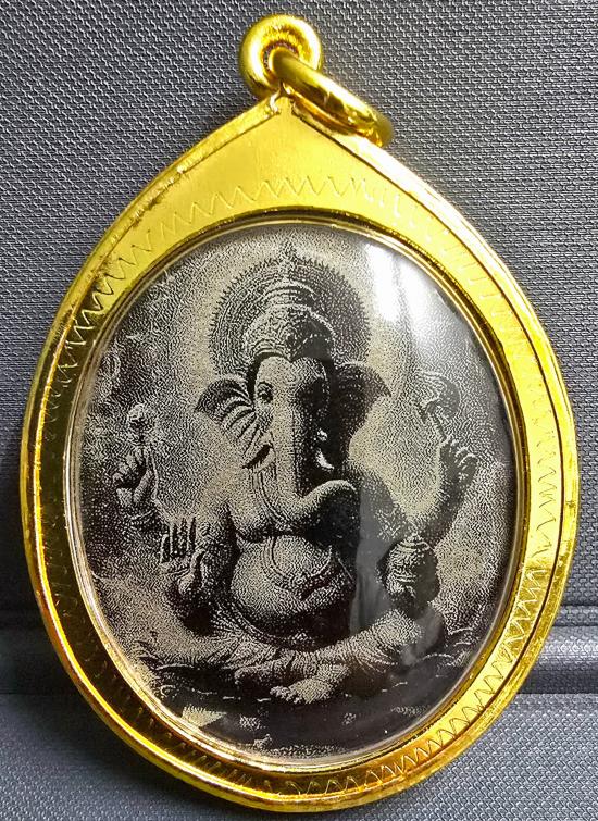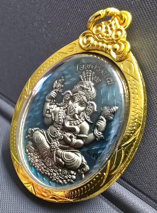 เนื้ออัลปาก้าซาติน ลงยาฟ้า หลังเรียบเลเซอร์พระพิฆเนศ เลี่ยมกรอบชุบทองพับหลัง