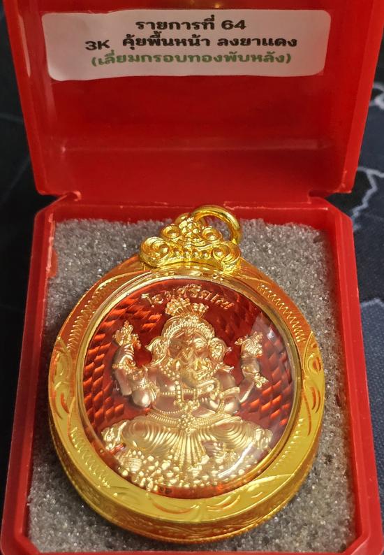 เนื้อ 3k คุ้ยพื้นหน้า ลงยาแดง เลี่ยมกรอบชุบทองพับหลัง