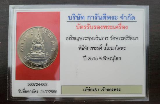 เหรียญพระพุทธชินราช ปี2515 เนื้อนวะ พิธีจักรพรรดิมหาพุทธาภิเษก ณ พระวิหารหลวงพ่อพระพุทธชินราช วัดพระศรีรัตนมหาธาตุฯ จ.พิษณุโลก ๒๐ มกราคม ๒๕๑๕ เมื่อวันที่ ๒๐ ม.ค.๒๕๑๕ พุทธสมาคมพิษณุโลก ได้จัดพิธี "จักรพรรดิมหาพุทธาภิเษก" ขึ้น ณ พระวิหารหลวงพ่อพระพุทธชินราช วัดพระศรีรัตนมหาธาตุวรมหาวิหาร จ.พิษณุโลก เพื่อนำวัตถุมงคลที่จัดสร้างขึ้นเข้าพิธีปลุกเสก เหรียญ "มหาจักรพรรดิ"