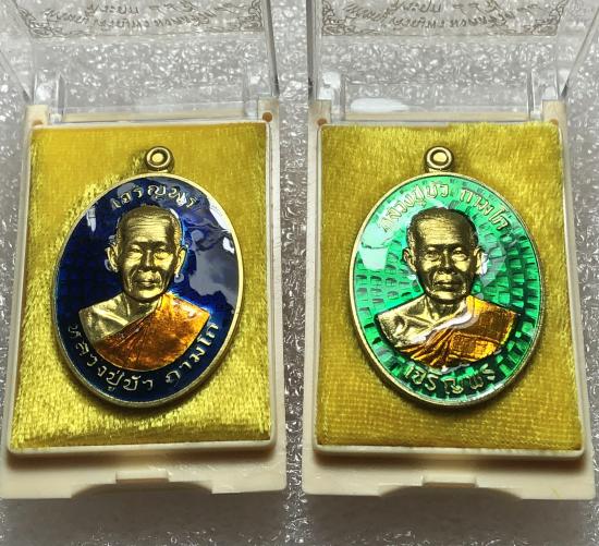 เหรียญเจริญพรบน-ล่าง หลวงปู่บัว ถามโก วัดศรีบุรพาราม จ.ตราด รุ่น เจริญพรมงคลชีวิต ๘๘ เนื้อทองทิพย์ลงยา เลข ๙๘๒ ทั้งคู่ เลขสามหลัก ปี๒๕๕๗ พระสวย มีกล่องเดิม