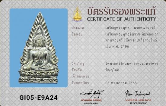 เหรียญพระพุทธชินราช พิมพ์อกเลาพานพระศรี เนื้อทองเหลือกะไหล่เงินปี2496 พร้อมบัตร