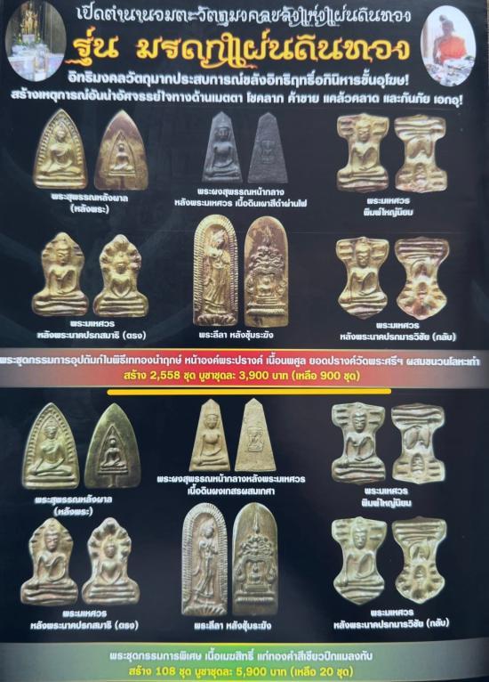 ตำนานแห่งพระกรุที่เปี่ยมด้วยประสบการณ์มากมายจากอดีตถึงปัจจุบัน รุ่นมรดกแผ่นดินทอง มงคลนามของยอดวัตถุมงคลชื่อดัง ปรากฏความล่ำค่าดุจมรดกของขลังแห่งแผ่นดิน พิธีกรรมภาวนาอธิษฐานจิตปรกปลุกเสกและมหาพุทธาภิเษก รวม 3 วาระสำคัญ เพื่อการบูรณะปฏิสังขรณ์กุฏิสงฆ์วัดพระศรีรัตนมหาธาตุ จ.สุพรรณบุรี รายการจัดสร้าง พระมเหศวรพิมพ์ใหญ่นิยม พระมเหศวร หลังพระนาคปรกปางสมาธิ พระมเหศวร หลังพระนาคปรกปางมารวิชัย พระลีลาหลังซุ้มระฆัง พระผงสุพรรณ พิมพ์หน้ากลางเนื้อดินเผา |
