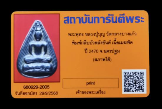 พระกลีบบัวหลังยันต์ เนื้อเมฆพัด หลวงปู่บุญ วัดกลางบางแก้ว จ.นครปฐม พ.ศ. 2470(อายุเกือบ 100 ปี) พร้อมบัตรรับรอง ครับ