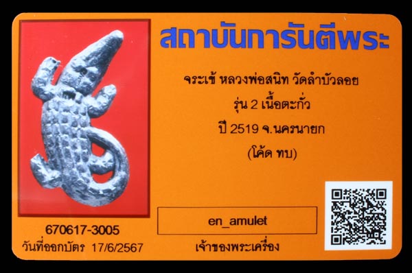 จรเข้ หลวงพ่อสนิท วัดลำบัวลอย จ.นครนายก รุ่น 2 ตอกโค๊ตอุ+ทบ. เนื้อตะกั่ว ปี 2519 สภาพสมบูรณ์ พร้อมบัตร G-pra ครับ