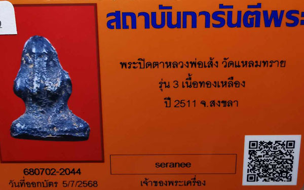 พระปิดตาหลวงพ่อเส้ง วัดแหลมทราย รุ่น3 เนื้อทองเหลือง ปี2511 จ.สงขลา + บัตร G-pra สภาพเดิมค่ะ |