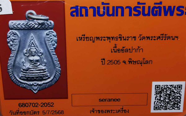 เหรียญพระพุทธชินราช วัดพระศรีฯ เนื้ออัลปาก้า ห่วงเดิม ปี2505 จ.พิษณุโลก + บัตรG-pra สภาพเดิมค่ะ |