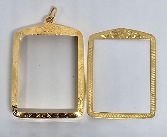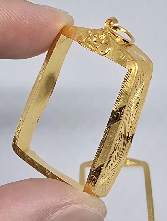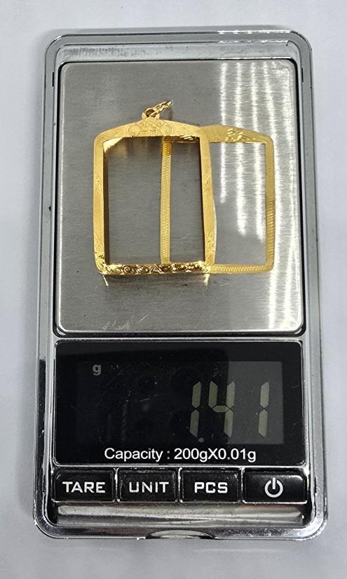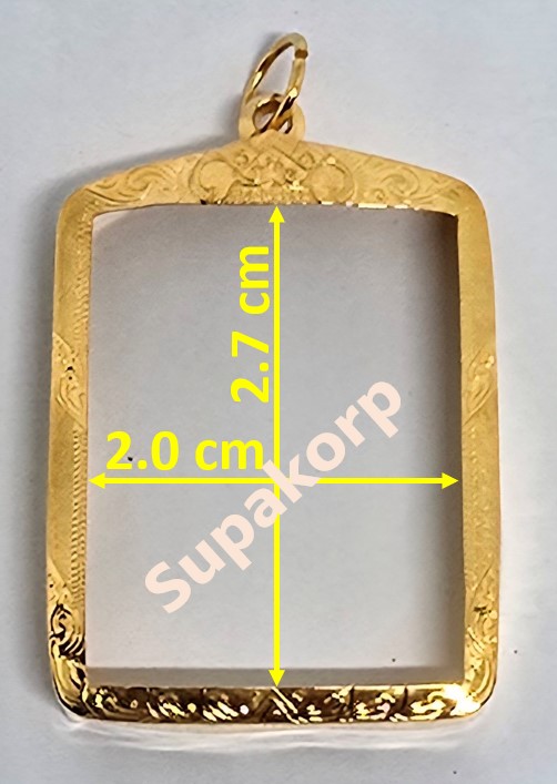 กรอบทองคำแท้ 80% มือ 1 ยกซุ้ม ขนาดหน้าจอ 2.0x2.7 cm. ใส่พระคำข้าว หางหมาก หลวงพ่อฤาษี ลิงดำ, สแตมป์ปี30ไม่มีหู พระสมเด็จทั่วไปที่มีขนาดใกล้เคียง น้ำหนัก 1.41 กรัม