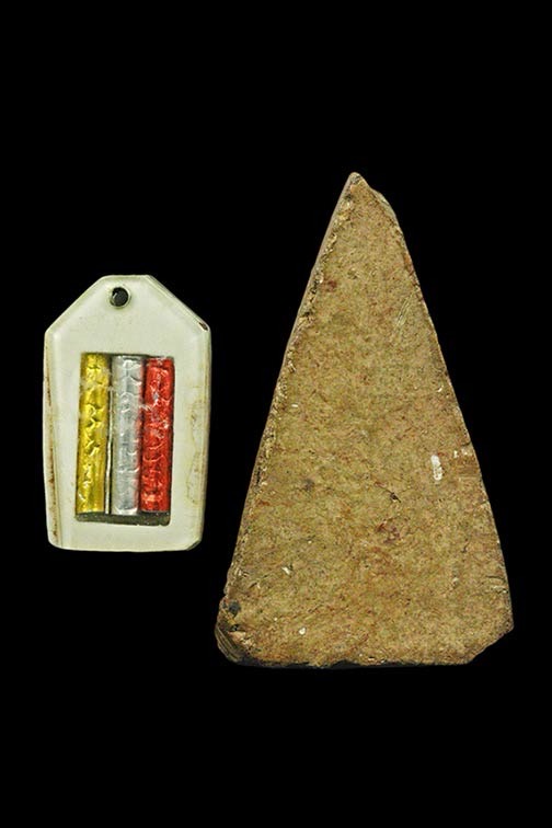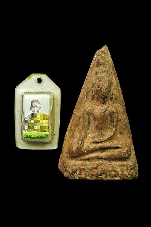 พระเนื้อดิน (พิมพ์สมเด็จพระพุทธโคดม) ปางประทานพร พิมพ์เล็ก หลวงพ่อขอม วัดไผ่โรงวัว จ.สุพรรณบุรี ปี 2505 กับรูปถ่ายกับพระพิมพ์ |