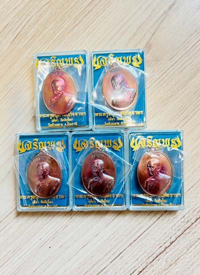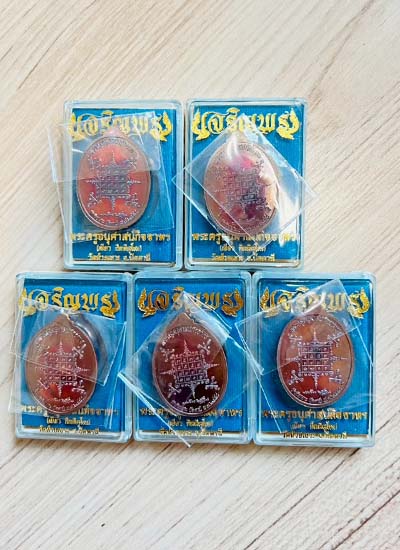 วัดใจ เหรียญเจริญพร พ่อท่านเขียว วัดห้วยเงาะ จ.ปัตตานี เนื้อทองแดงผิวรุ้งหลังยันต์ 5 เหรียญ |