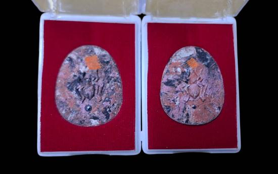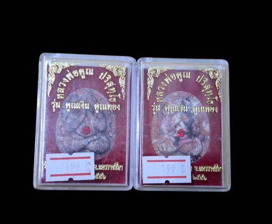 มาคู่ พระปิดตา หลวงพ่อคูณ วัดบ้านไร่ รุ่นคูณเงิน คูณทอง ปี56 (เนื้อก้นครก ฝังตะกรุดเงินคู่ อุดพลอย หลังแมงมุมดักทรัพย์ ติดจีวร) พร้อมกล่องเดิม