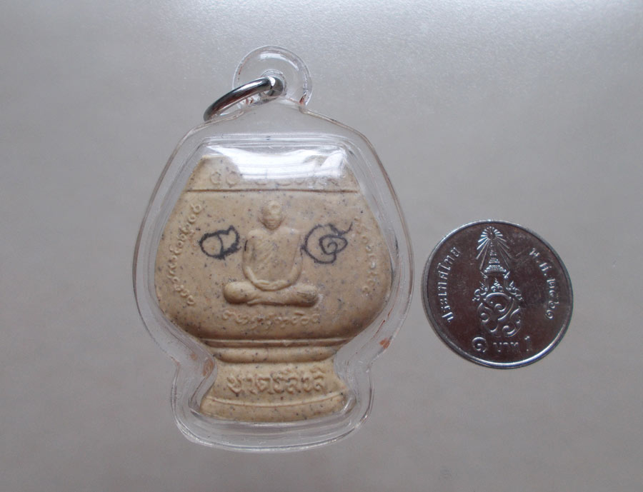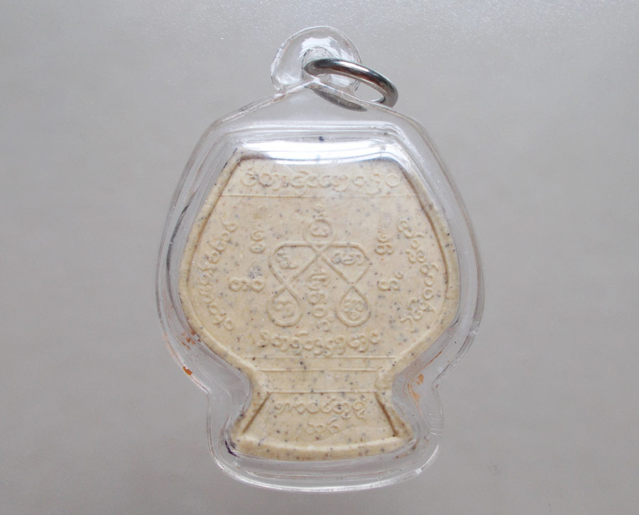 ด้านหลังมียันต์โภคทรัพย์ตำรามอญ ( แม่ค้าชอบนำมาไว้ในกระจาดใส่เงิน - กระป๋องตังค์ )....พุทธคุณเด่นด้านทำมาค้าขาย