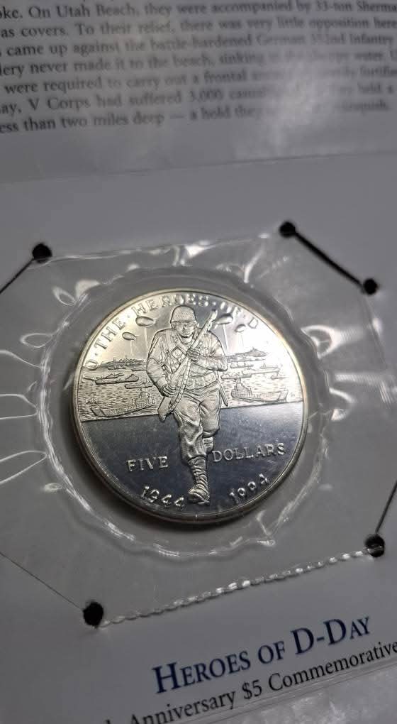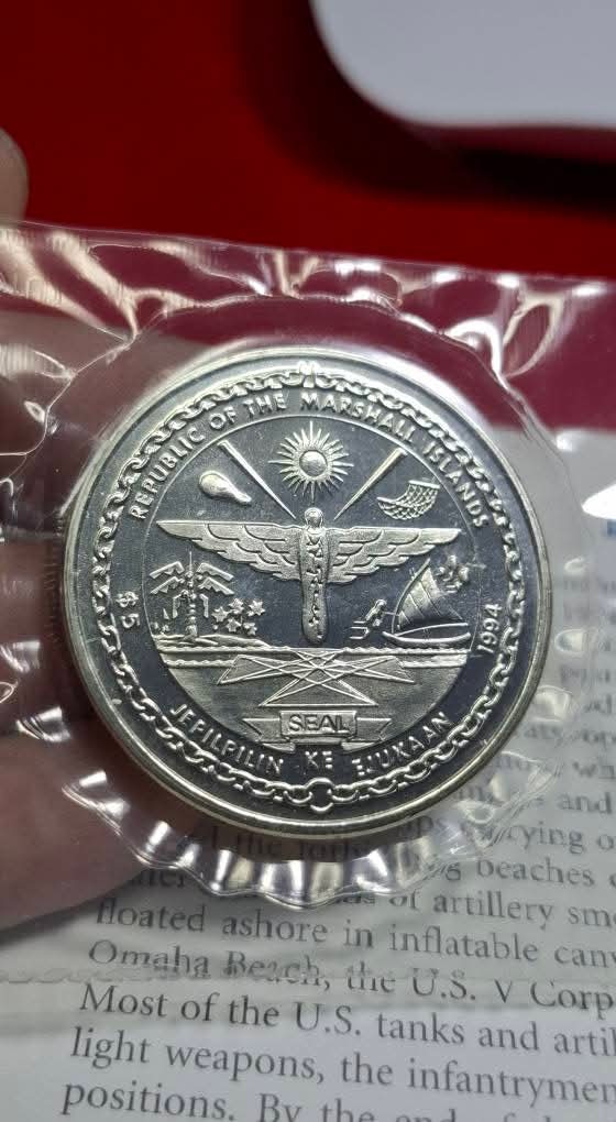 เหรียญกษาปณ์ที่ระลึก "Heroes of D-Day" ครบรอบ 50 ปี มูลค่า 5 ดอลลาร์ของหมู่เกาะมาร์แชลล์ ปี 1994 |