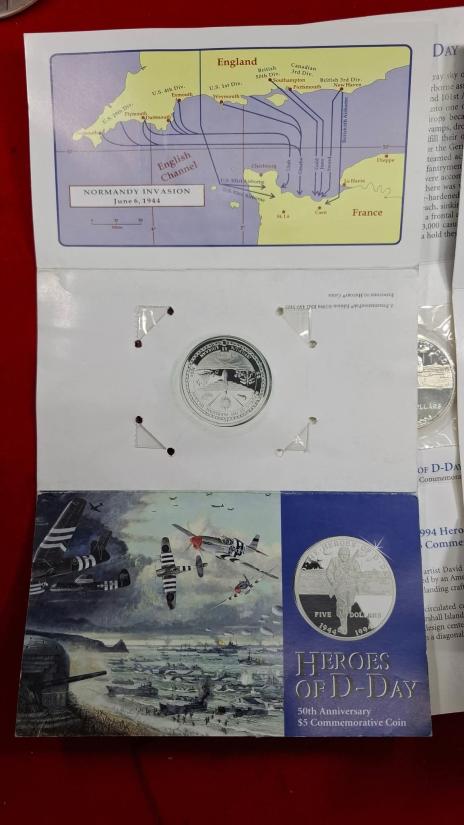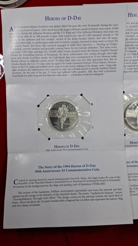 เหรียญกษาปณ์ที่ระลึก "Heroes of D-Day" ครบรอบ 50 ปี มูลค่า 5 ดอลลาร์ของหมู่เกาะมาร์แชลล์ ปี 1994 (ทั้งหมด 3เหรียญ) |