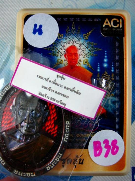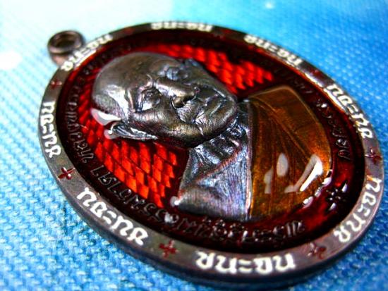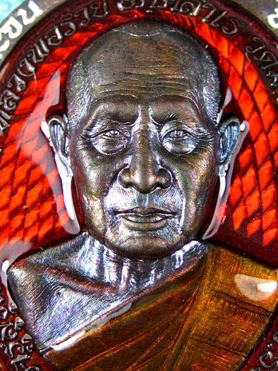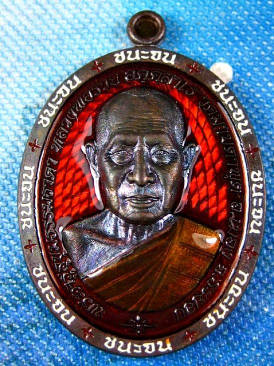 เหรียญชนะจน เนื้อนวะโลหะ ลงยาส้ม ลงยาจีวร ลงยาขอบรวย ฝังพลอยเขียว หลวงพ่อรวย วัดมาบตาพุด จ.ระยอง (---B38---) |