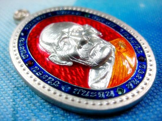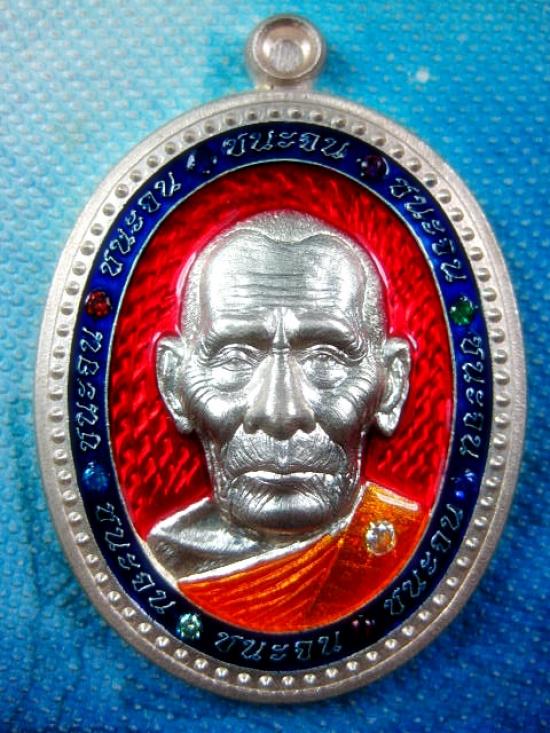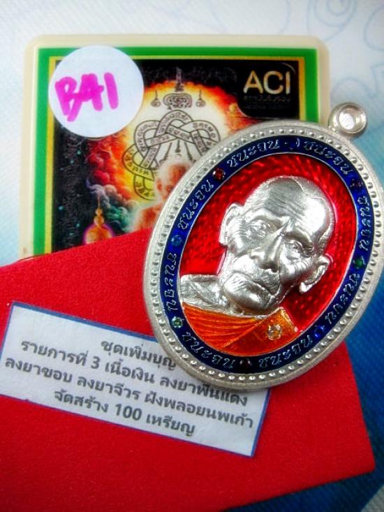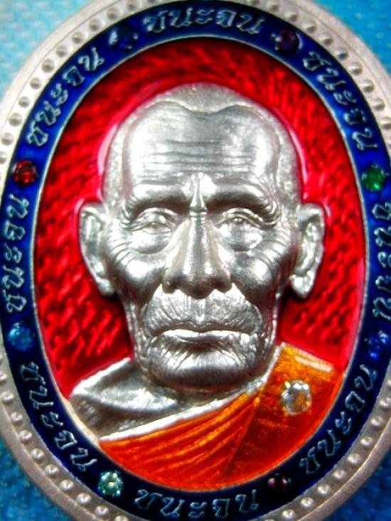 ## เนื้อเงิน ## เหรียญ ชนะจน ชุดเพิ่มบุญ รายการที่ 3 เนื้อเงินลงยาพื้นแดง ลงยาขอบ ลงยาจีวร ฝังพลอยนพเก้า หลวงปู่สมาน สุธัมโม ที่พักสงฆ์เขายางหัก อ.ปากท่อ จ.ราชบุรี (---B41---)