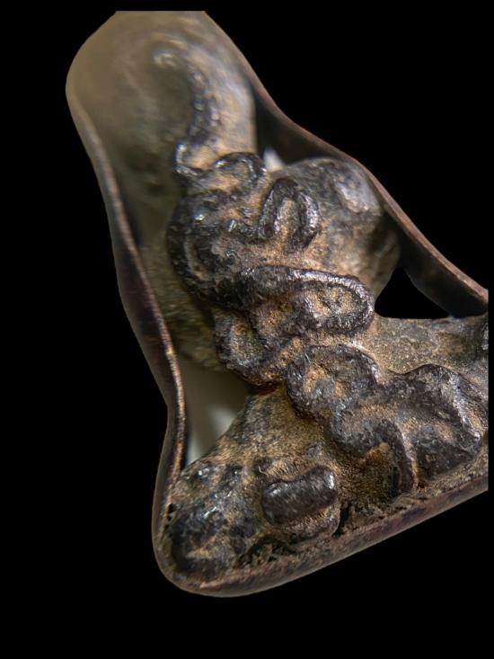 พระปิดตา ของดีสายเก่าแท้ เนื้อจัดคล้ำ มีคราบเก่าและปรอทแทรกทั่วองค์อย่างเป็นธรรมชาติ ด้านหลังมีลวดลายคล้ายยันต์เก่าขึ้นพองาม ผิวเดิมไม่ผ่านการล้าง ดูมันส์ตา เซียนเห็นแล้วต้องเหลียว