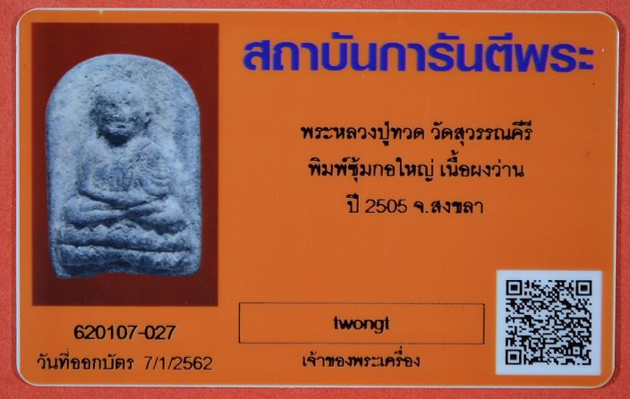 พระสภาพสวยมาก ผิวเดิมๆ ขนาดพระ กว้าง 2.5 ซม สูง 3.6 ซม หนา 1 ซม จำนวนการสร้างไม่มากนัก พระพิธีสุดยอดแห่งการสร้างหลวงปู่ทวดอีกครั้งนับตั้งแต่ได้มีการจัดสร้างกันมา ปกติใครๆ ก็กล่าวกันว่าหลวงปู่ทวด ให้ทันอาจารย์ทิมปลุกเศก นับว่าใช้ได้ แต่วัดสุวรรณคีรี มีดีซ้ำซ้อนด้วยเกจิ 108 รูป ที่เด่นชัดก็เพิ่มเติมด้วย พ่อท่านคล้าย วัดสวนขัน ,พ่อท่านเส้ง วัดแหลมทราย , อาจารย์วัน วัดปากพะยูน และอีกหลายเกจิซึ่งได้รับการบันทึกไว้ในประวัติการสร้างของทางวัดสุวรรณคีรี หากจะหาหลวงปู่ทวดต่างวัดที่ทันท่าน อ.ทิม และราคายังไม่แรงมากนัก ขอแนะนำหลวงปู่ทวด วัดสุวรรณคีรี จ.สงขลา  บัวคมชัด หลังยันต์ พร้อมบัตรรับรองจีพระ รับประกันตามกฏของเวป  โอนเงินแล้วกรุณาแจ้งทางกล่องข้อความด้วยน่ะครับ โปรดแจ้งที่จัดส่งใหม่หากมีการเปลี่ยนแปลง ขอบคุณครับ |
