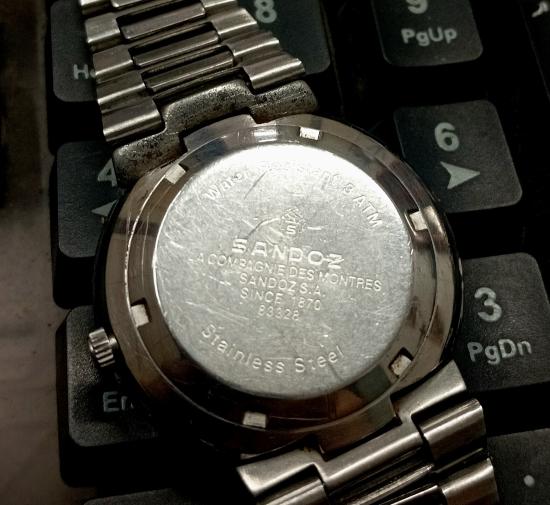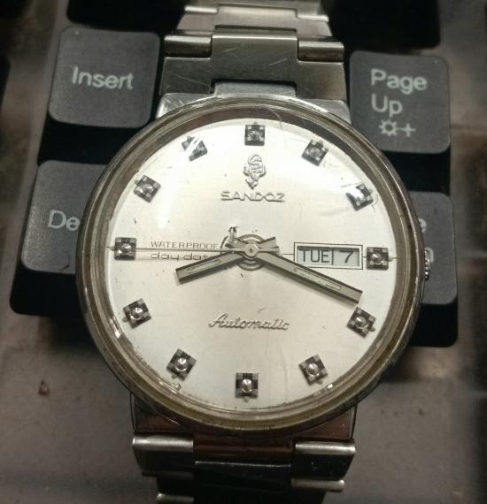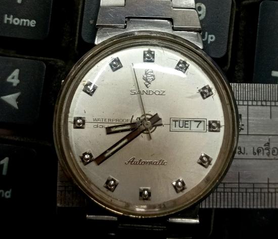 ลงใหม่ครับ ผู้ชนะโดนคำติไป4โทรถามไม่ขอรับ **วินเทจ คลาสสิค อายุเกือบ50ปี**Sandoz automatic since1870 เลข 83328 ขนาด38 มม.วันที่ตั้งเร็วได้ เครเดินปกติเครื่ กระจกมีรอยตรงกลางจอนิดนึงพิจารณาก่อนเคาะครับ