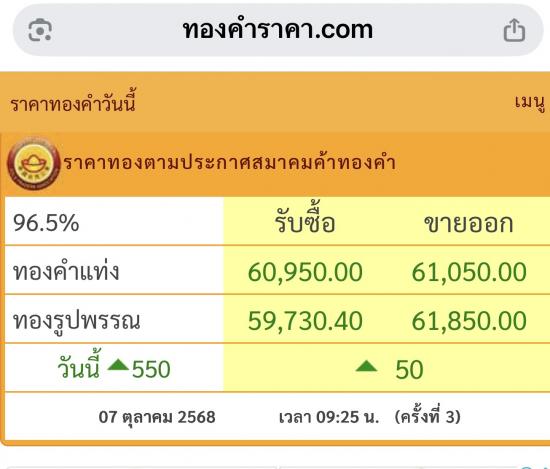 ทองคำตลาดโลก ทะลุ 61,000 ต่อ 1 บาททองคำ