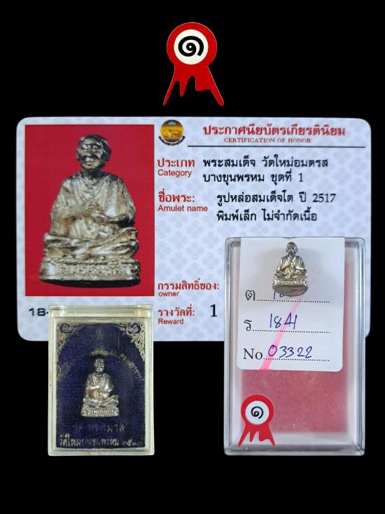 แชมป์รางวัลที่1 รูปหล่อสมเด็จโตบางขุนพรหม เนื้อเงิน ปี17 ตอกโค๊ต วัดใหม่อมตรสบางขุนพรหม พร้อมใบประกาศฯ รับประกันแท้ตามมาตรฐานสากล |