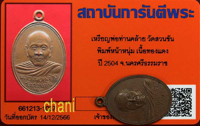 เหรียญ พ่อท่านคล้าย วัดสวนขัน พิมพ์หน้าหนุ่ม เนื้อทองแดง ปี2504 จ.นครศรีธรรมราช สภาพสวยๆ เดิมๆ พร้อมบัตรรับรองจากจีพระอุ่นใจได้ ค่ะ |