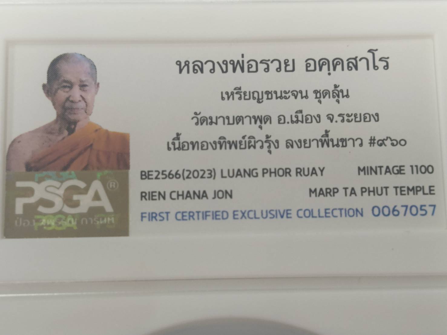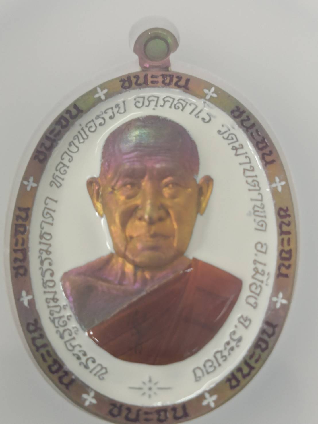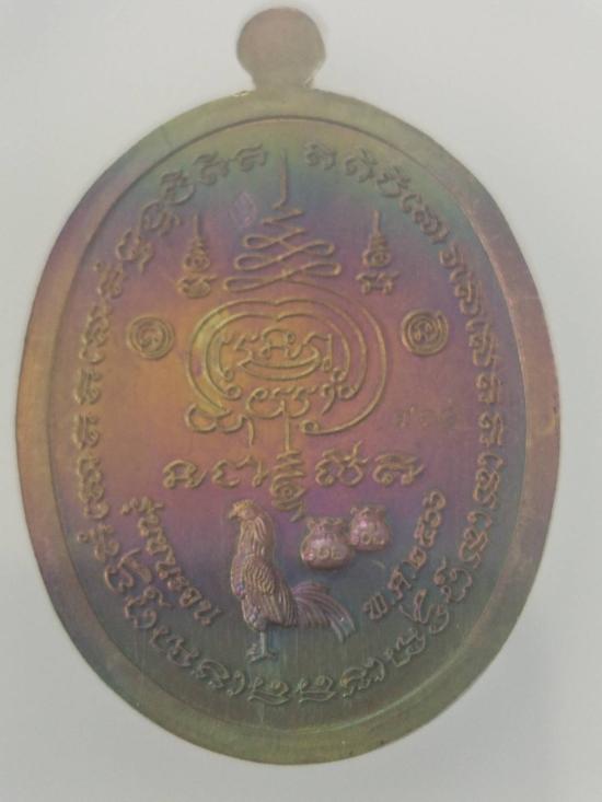 เหรียญชนะจน ชุดลุ้น หลวงพ่อรวย วัดมาบตาพุด ระยอง เนื้อทองทิพย์ผิวรุ้ง ลงยาพื้นขาว No.960 (สร้าง1,100 เหรียญ) ปี2566 งานPSGA สมบัติแห่งสยาม