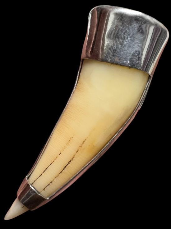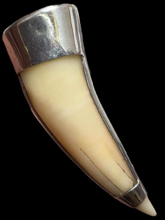 เขี้ยวเสือ เลี่ยมเงิน หนึ่งในเครื่องรางของธนสิทธิ์ที่มีมาตั้งแต่โบร่ำโบราณชายไทยหมอยาหมอผีหรือนักรบในยุคโบราณชอบมีพกติดตัวเพราะเชื่อในพุทธคุณกันคุณไสยเสนียดจัญไรรักษาผีเข้าและยังเป็นเครื่องรางมหาอำนาจ |