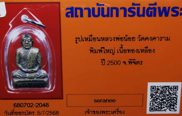 รูปเหมือนหลวงพ่อน้อย วัดคงคาราม เนื้อทองเหลือง ปี2500 จ.พิจิตร + บัตรG-pra สภาพเดิมค่ะ