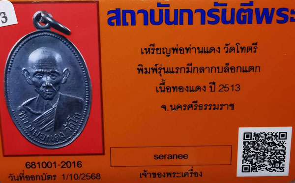 เหรียญหลวงพ่อแดง วัดโทตรี รุ่นแรกพิมพ์มีกลากบล๊อกแตก เนื้อทองแดง ห่วงเดิม ปี2513 จ.นครศรีธรรมราช + บัตรG-pra สภาพเดิมค่ะ |