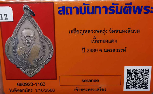 เหรียญหลวงพ่อรุ่ง วัดหนองสีนวล เนื้อทองแดง ปี2489 จ.นครสวรรค์ + บัตรG-pra สภาพเดิมค่ะ |