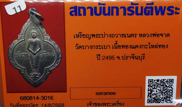(วันอาทิตย์)เหรียญพระปางถวายเนตร หลวงพ่อจาด วัดบางกระเบา เนื้อทองแดงกะไหล่ทอง ห่วงเดิม ปี2495 + บัตรG-pra สภาพเดิมค่ะ |