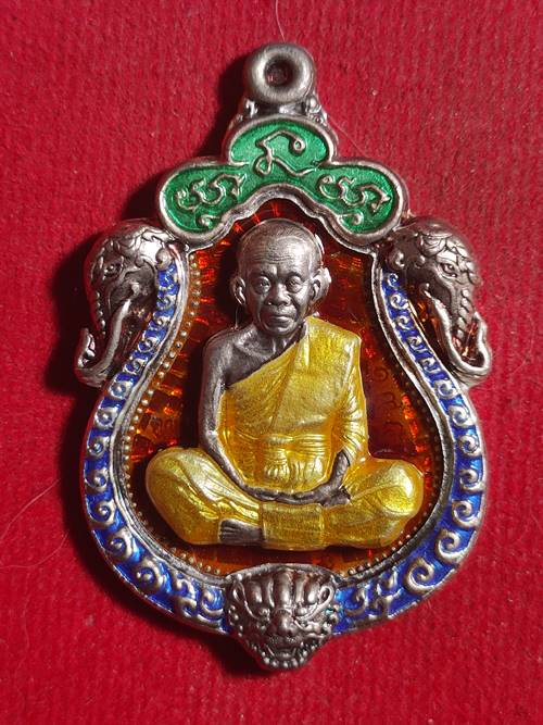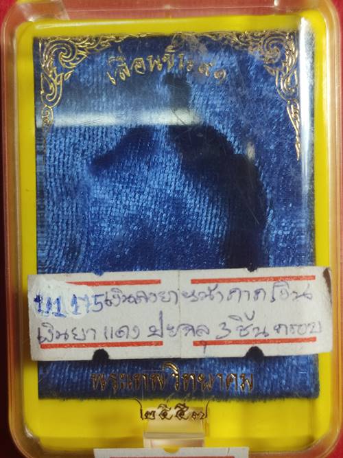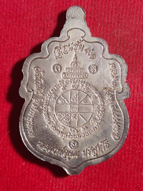 เหรียญเสมาเลื่อนขั้น 91 หลวงพ่อคูณ ปริสุทโธ ออกวัดบ้านไร่ ปี 2557 เนื้อ เงินลงยาสีแดงประกบ 3 ชิ้น กรอบเงินลงยาหน้ากากเงิน หมายเลข 175 เคาะเดียวแดง