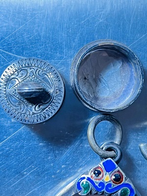 เงินไว้หลอม งานแกะมือสั่งทำ ใช้ชำรุด ทั้งกรอบพระ ห่วงเงิน ตะขอ น้ำหนัก 18.2 กรัม ..