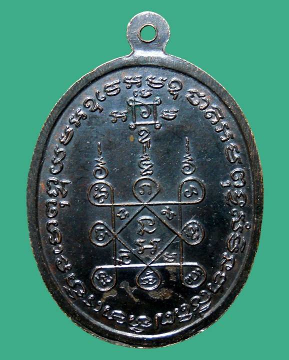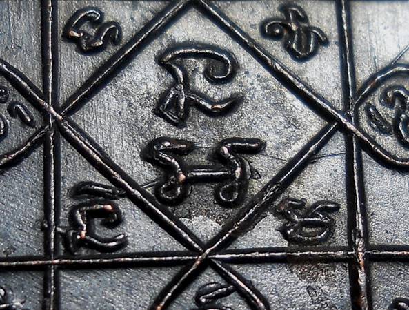 เหรียญบล็อก"ยันต์ทะลุ" ตัว"อะ"ขอมที่ด้านหลังเหรียญมีเส้นวิ่งทะลุไปทางขวา