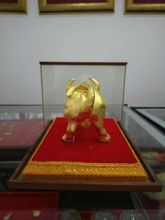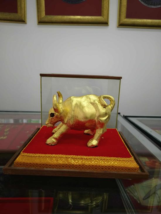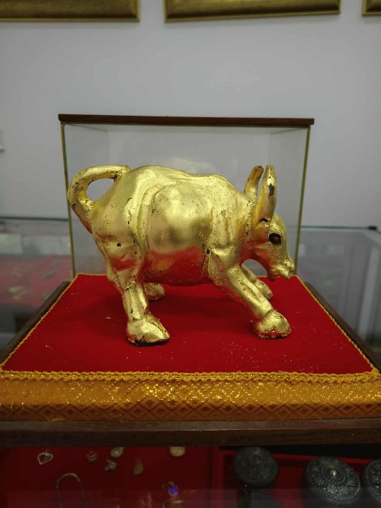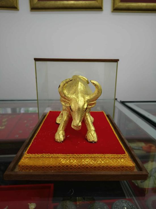 ไม้มงคลแกะรูปควายท่าเตรียมพุ่งชน แป๊ะทองคำแท้ ยิงเปอร์เซ็นได้ 42.20% ขนาด 14x10x11 พร้อมฐานวางกรอบกระจกหนา งานเก่าเก็บ ท่านที่มองหาของขวัญหรือเครื่องประดับตกแต่ง ดูแล้วมีค่าไม่ควรพลาดครับ |