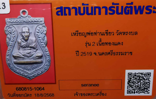 เหรียญพ่อท่านเขียว วัดหรงบล รุ่น2 เนื้อทองแดง ปี2519 จ.นครศรีธรรมราช + บัตรG-pra สภาพเดิมค่ะ |
