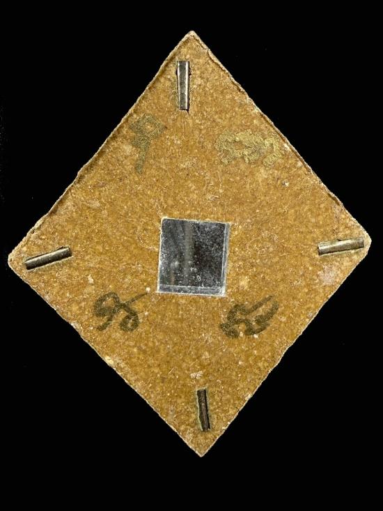 ด้านหลังองค์พระประดับด้วยแผ่นกระจก เป็นคันฉ่องโบราณใช้สะท้อนสิ่งไม่ดี ปราบสิ่งเลวร้าย ข่มคู่แข่ง แผ่นกระจกนี้ผ่านการเสกจากยอดเกจิอาจารย์มามากต่อมาก กันดวงตก แก้ดวงไม่ดี แก้ดวงชงก็ได้