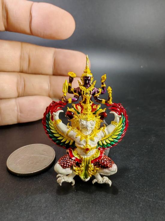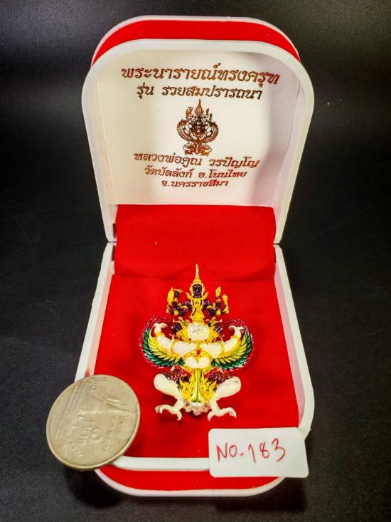 ( วัดใจ 109 บาท ) พุทธศิลป์ พระนารายณ์ทรงครุฑ รุ่น รวยสมปราถนา หลวงพ่อคูณ วรปัญโญ วัดบัลลังก์ อ.โนนไทย จ.นครราชสีมา เนื้อมหาชนวนชุบเงินเพ้นท์สีกายสีขาว องค์พระนารายณ์สีม่วง แจกศูณย์จอง No.183 เลขสวย กล่องเดิม