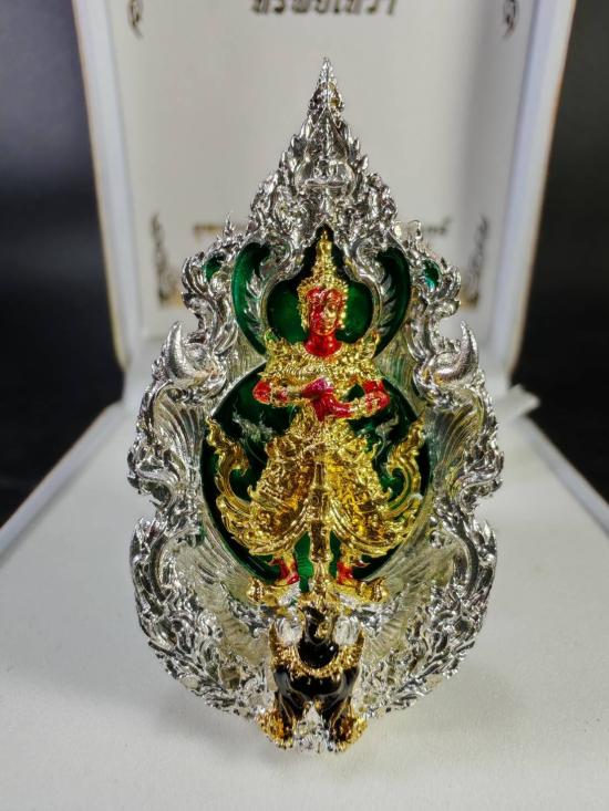 พุทธศิลป์ เหรียญท้าวเวสสุวรรณ รุ่น ทรัพย์เทวา วัดถ้ำเขาชะอางค์ จังหวัดกาญจนบุรี หน้าเทพพิมพ์ทรงจำปา หลังพญาเต่าเรือน(เต่ามังกร) รกที่.6 เนื้อบรอนซ์ชุบเงิน องค์ทองผิวแดงพื้นเขียว No.70 เลขสวย ราคาจอง 1099 บาท กล่องเดิม