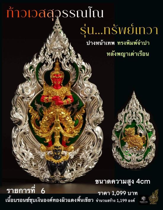 ( วัดใจ 109 บาท ) พุทธศิลป์ เหรียญท้าวเวสสุวรรณ รุ่น ทรัพย์เทวา วัดถ้ำเขาชะอางค์ จังหวัดกาญจนบุรี หน้าเทพพิมพ์ทรงจำปา หลังพญาเต่าเรือน(เต่ามังกร) รกที่.6 เนื้อบรอนซ์ชุบเงิน องค์ทองผิวแดงพื้นเขียว No.70 เลขสวย ราคาจอง 1099 บาท กล่องเดิม