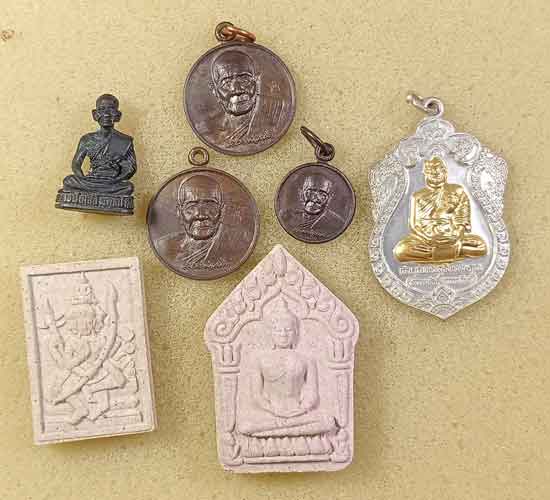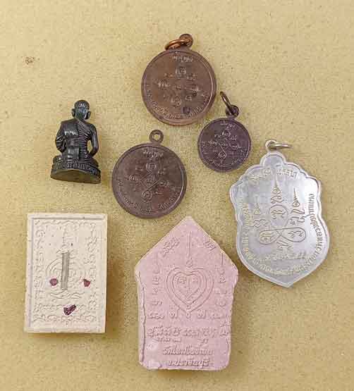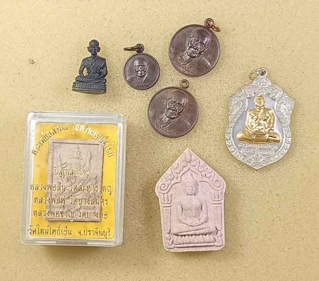 พระรูปหล่อหลวงพ่อเส็ง วัดศรีประจันตคาม ปราจีนบุรี +พระผง 2 องค์ วัดใหม่โพธิ์เย็น ปราจีนบุรี + เหรียญหลวงพ่อเกิด วัดโพธิ์แทน นครนายก ออกวัดดอนเปร่ง 3 เหรียญ+เหรียญหลวงพ่อตึ๋ง วัดหลวงพ่อปากแดง นครนายก |